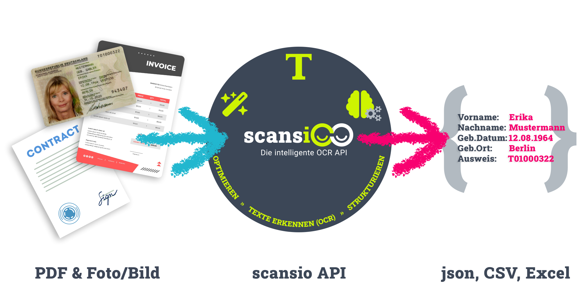 scansio wandelt nicht nur Bilder in Texte um, sondern erkennt konkrete Werte in den Dokumenten (z. B. Vorname, Adresse, Personalausweisnummer, usw.). Diese Werte werden Dir - natürlich verschlüsselt - als Ergebnis übermittelt. Danach löschen wir die Daten von unserem Server.
